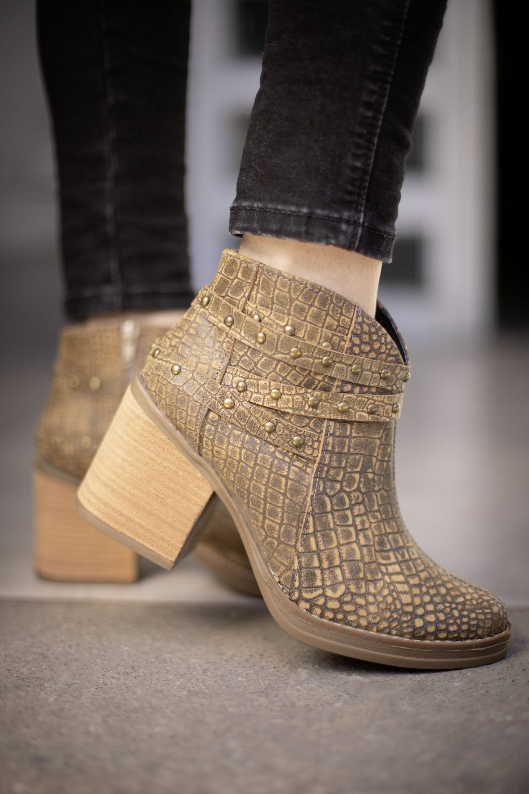 BOTINES CAFÉ CUERO REPTIL DE TACON ALTO: