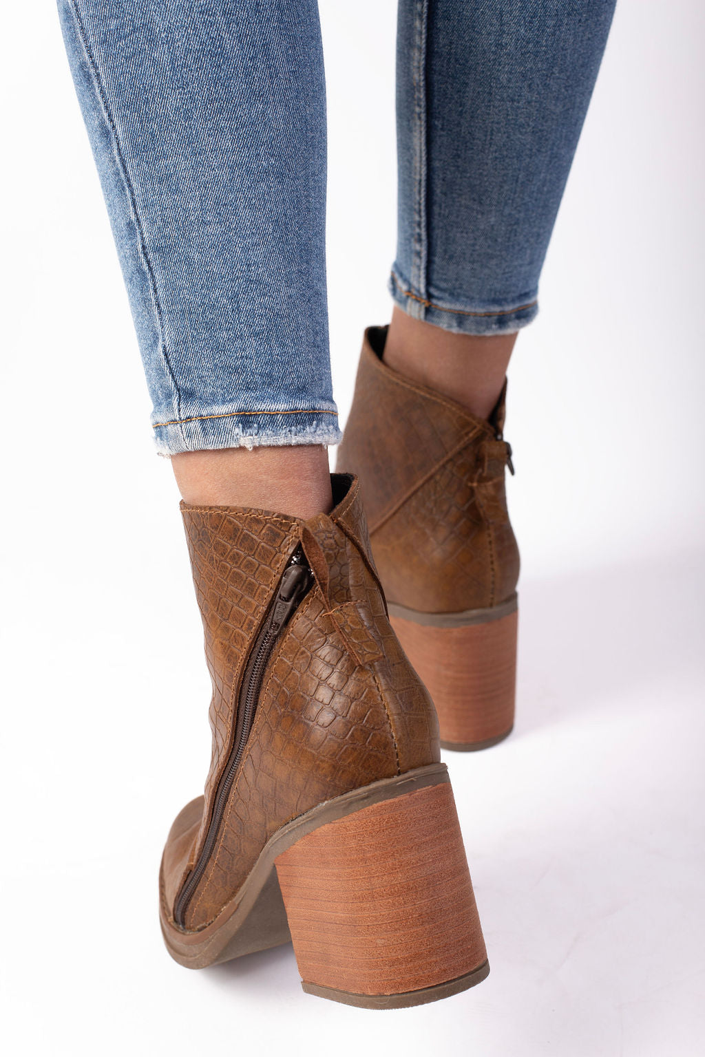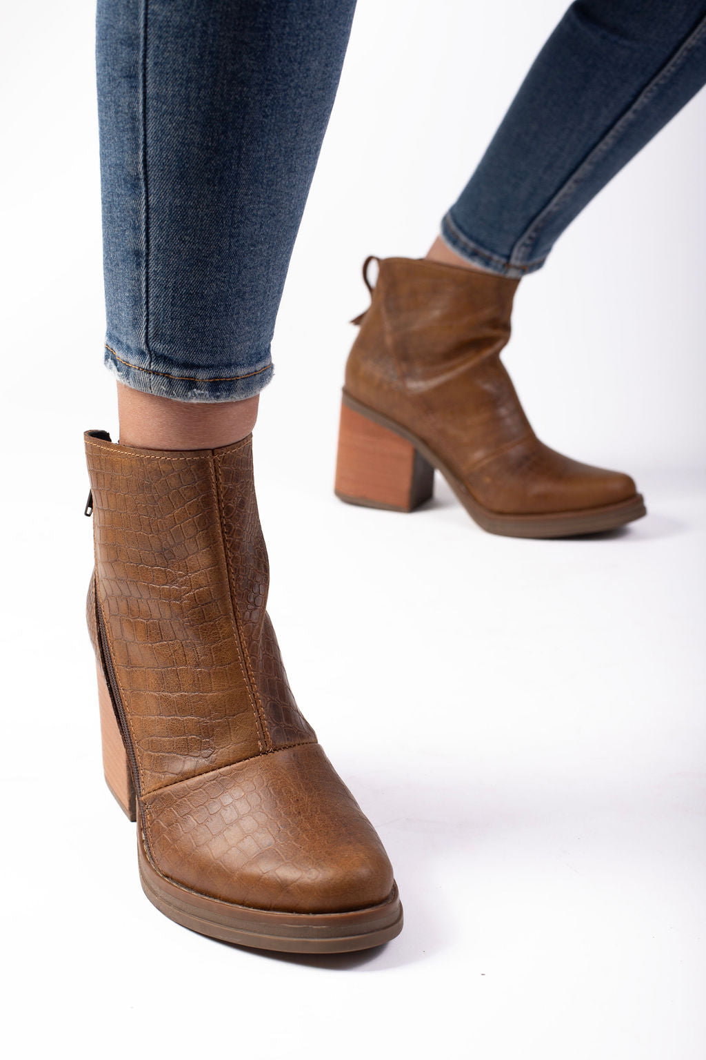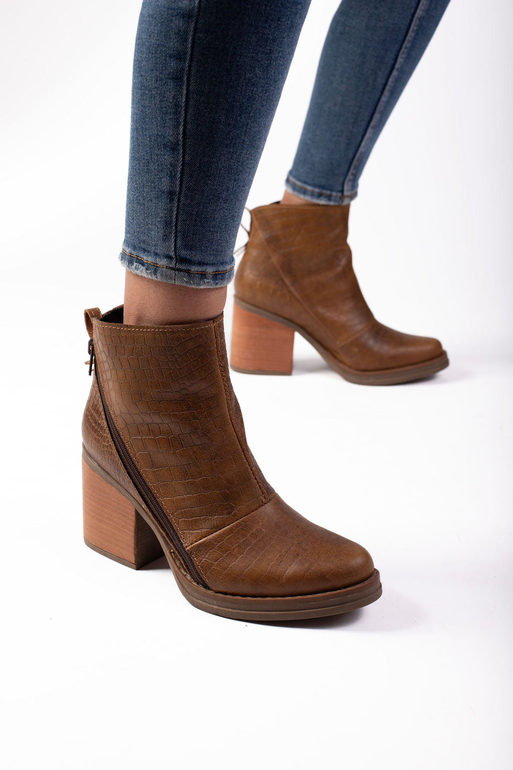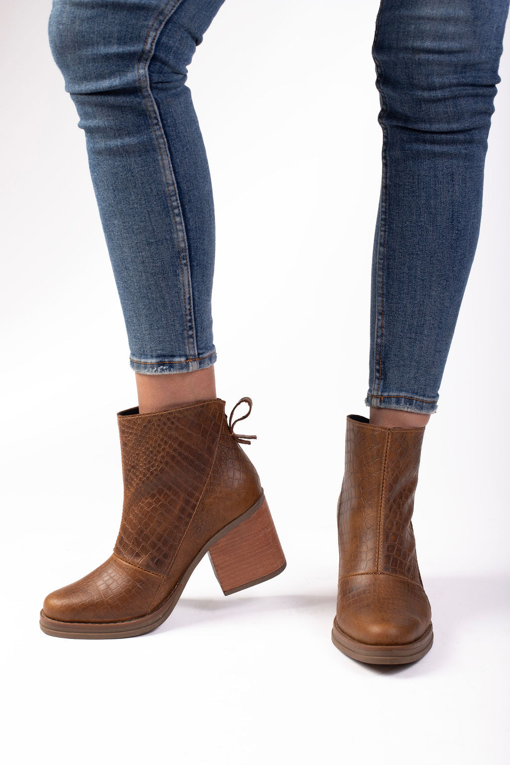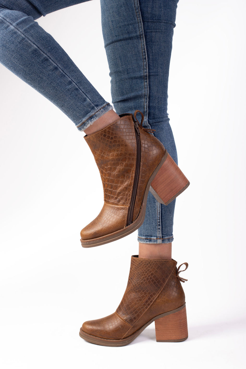 Este botín en cuero natural con textura croco es puro carácter y sofisticación. Su tacón alto de madera aporta elegancia y firmeza, mientras que el cierre lateral y detalle trasero anudado le dan un toque distintivo que no pasa desapercibido.
