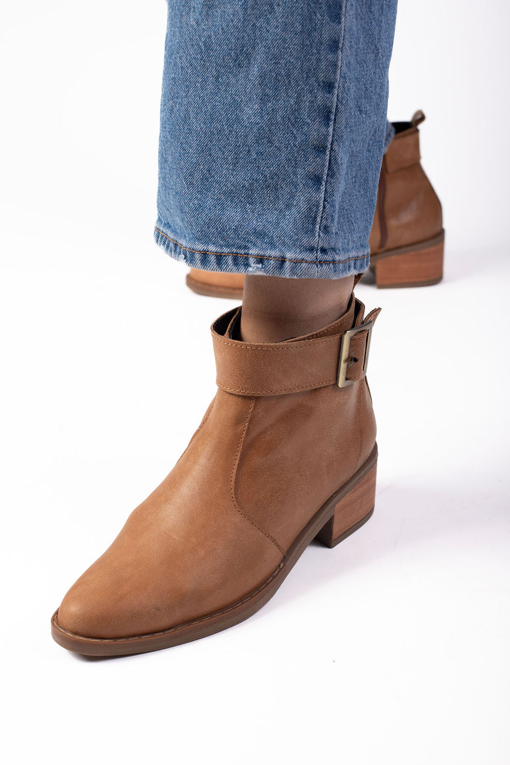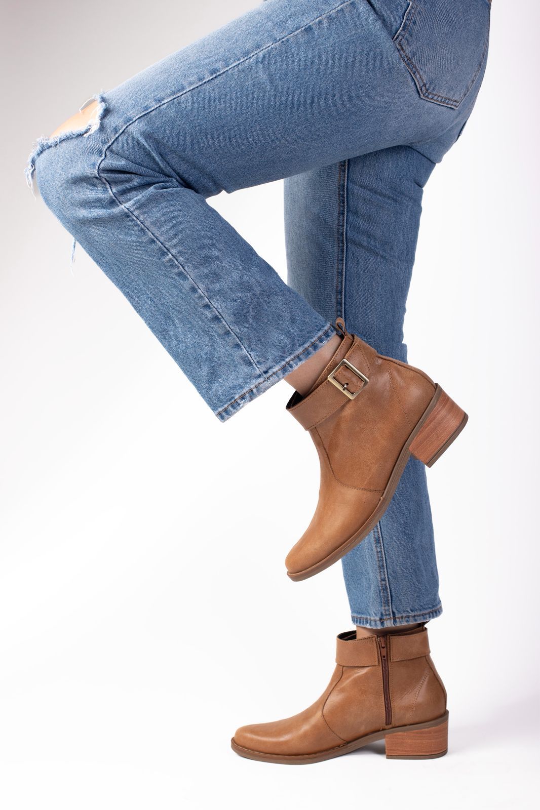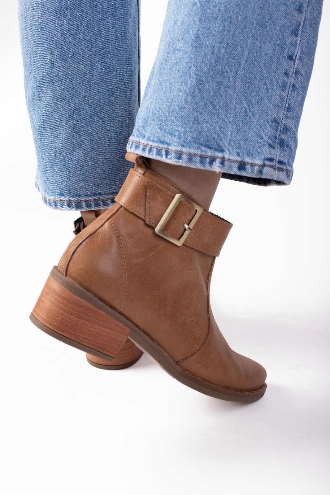Este botín de cuero natural en tono café es el equilibrio perfecto entre estilo, comodidad y durabilidad. Su diseño minimalista se complementa con una hebilla lateral que aporta carácter sin perder la sutileza.